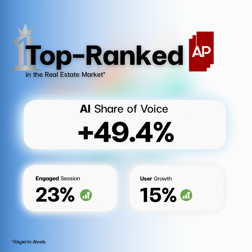 นอกจากการครองพื้นที่บน Google โจทย์สำคัญที่ AP Thai มอบให้เราคือ การขยายการมองเห็นแบรนด์ในยุค AI Search รวมถึงเพิ่มจำนวน Engaged Session และ User ต่อปีอย่างต่อเนื่อง พร้อมผลักดันให้ อัตราการเติบโตของ AI Mention สูงขึ้น เพื่อสะท้อนถึงพลังของแบรนด์ AP Thai ในการเป็นผู้นำตลาดอสังหาริมทรัพย์
